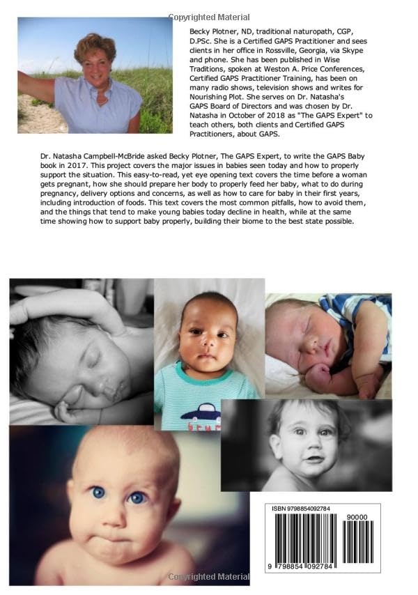 Dr. Natasha Campbell-McBride asked Becky Plotner, The GAPS Expert, to write the GAPS Baby book in 2017. "GAPS Baby, Building Baby's Biome" is an enlightening guide that offers valuable insights into nurturing your baby's gut health. The book emphasizes the significance of a healthy gut biome in a baby's overall well-being. It outlines practical strategies for parents to build a strong foundation for their baby's gut health, thereby enhancing their immunity, digestion, and cognitive development.