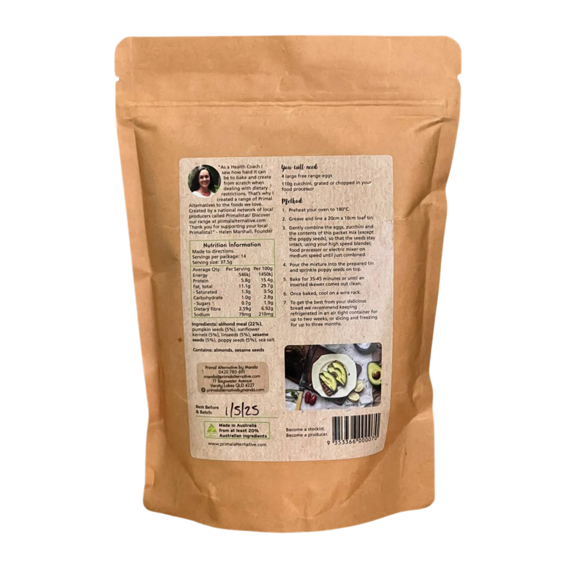 Ingredients: Almond meal, pumpkin seeds, sunflower kernels, linseeds, sesame seeds, poppy seeds, sea salt.