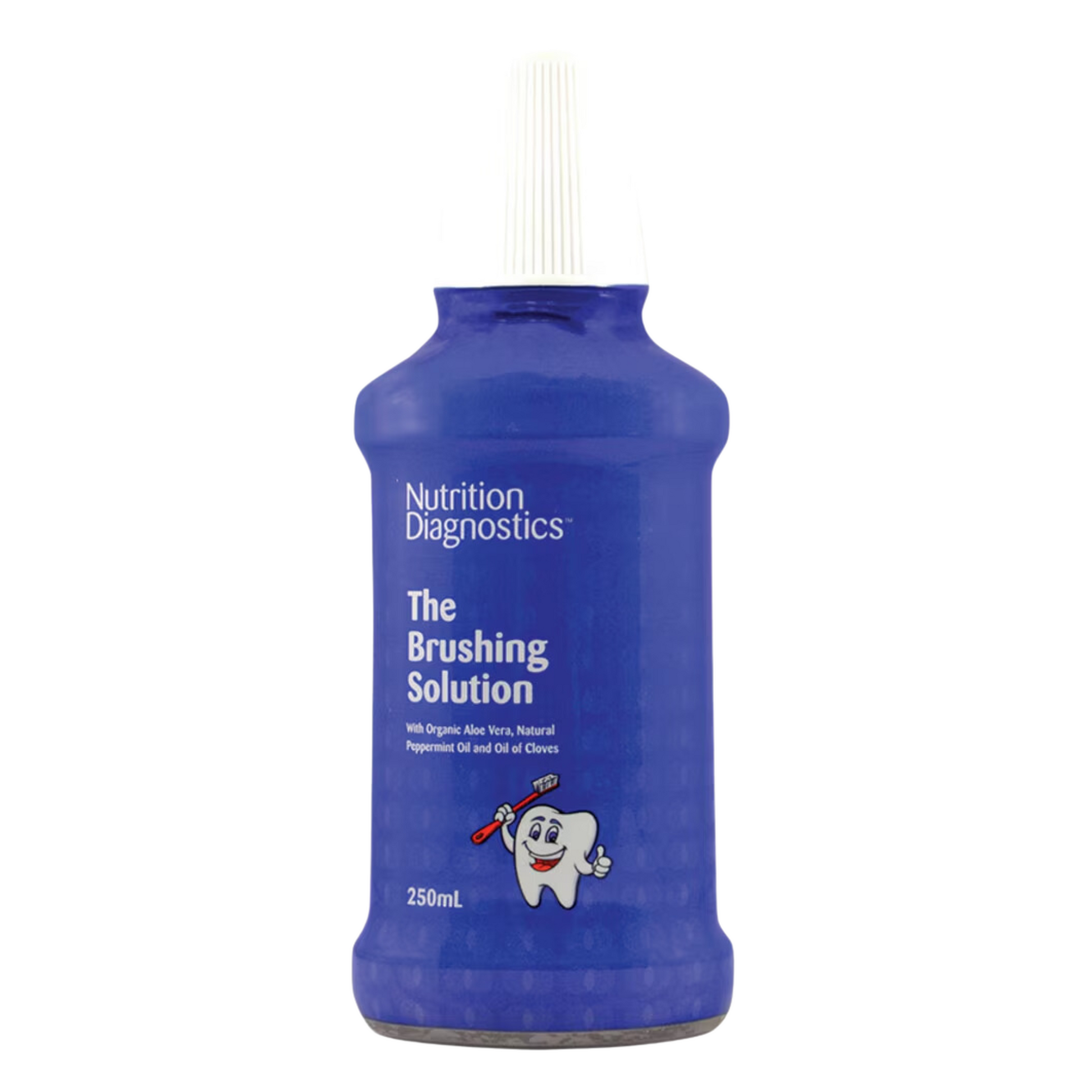The Brushing Solution is a toothpaste substitute formulated from a blend of hydrogen peroxide, oil of cloves, peppermint and organic aloe vera, and has been specifically formulated to improve oral hygiene and restore the natural balance of microbes in the mouth.